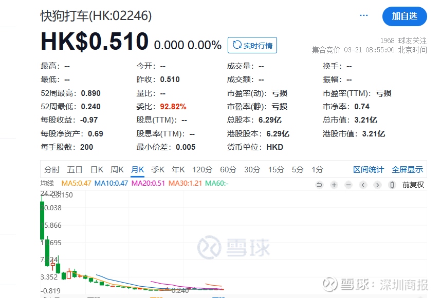 快狗打车成立于2017年6月8日,是知名的线上同城物流平台,2022年6月24日,快狗打车在港交所上市,发行价格为21.5港元/股,上市首日股价一度冲到23.15港元/股,随后开始“跌跌不休”,呈现“上市即巅峰”的走势。截至3月20日收盘,快狗打车股价收于0.51港元/股,跟发行价相比下跌97.63%,已不足发行价的零头,公司市值也只剩下3.21亿港元。