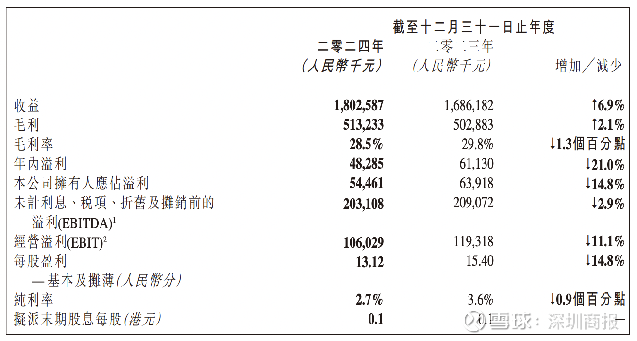 财报显示,嘉士利集团的年内除税后溢利约0.48亿元,由2023年的约0.61亿元减少21.0%。同时,财报显示,公司2024年净利润率为2.7%,而上年同期年为3.6%,同比下降0.9%。