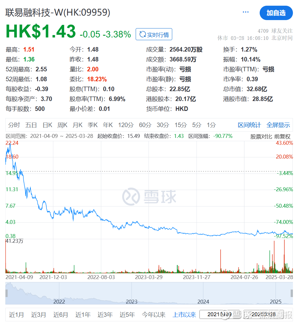 自上市以来,联易融股价持续下跌。截至3月28日收盘,该股报1.430港元/股,与上市时相比已跌去九成。公司最新总市值32.68亿港元,比上市时蒸发逾90%。