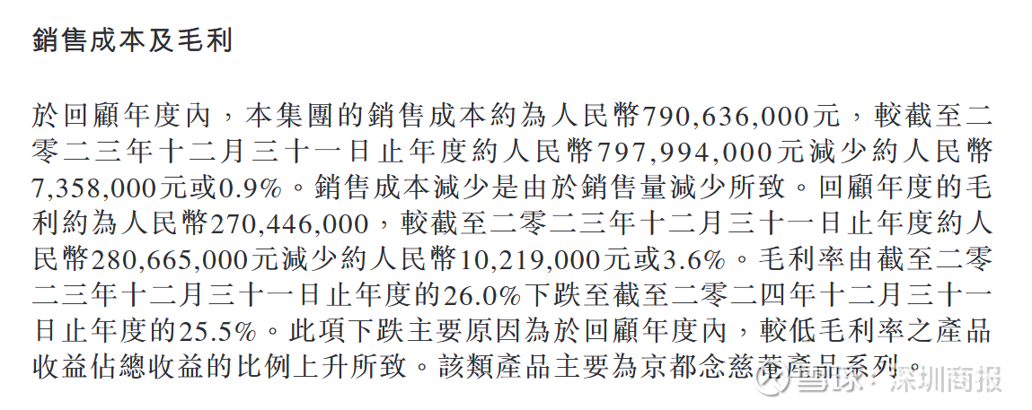 2024年,金活医药毛利減少3.6%,毛利率下跌0.5個百分點至25.5%。公司解释此项下跌主要原因为于年度內,较低毛利率之产品收益占总收益的比例上升所致。该类产品主要为京都念慈菴产品系列。
