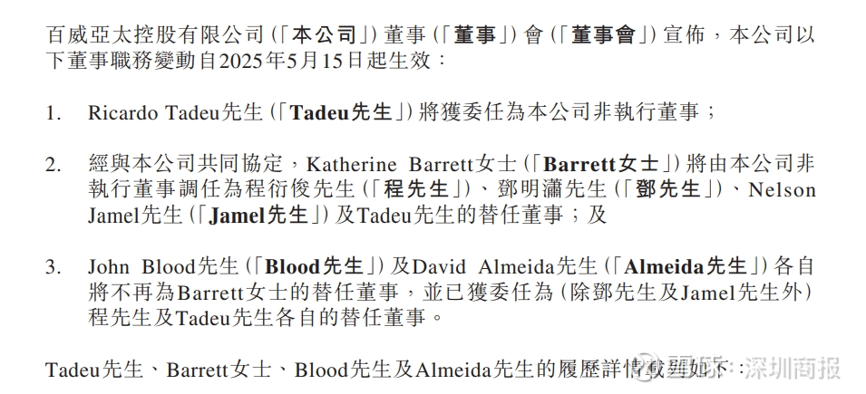 具体来看,Ricardo Tadeu被委任为非执行董事,而Katherine Barrett则由非执行董事调任为Tadeu等人的替任董事。此外,John Blood和David Almeida将分别担任程衍俊和Tadeu的替任董事。