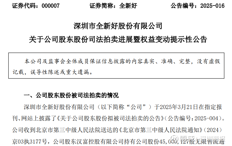 6月9日晚间,深圳本地上市公司全新好(000007)发布公告,公司股东汉富控股有限公司持有的4500万股无限售流通股(占公司总股本12.99%)于2025年4月24日至4月25日在淘宝网司法拍卖平台进行公开拍卖,最终于4月25日,用户姓名林文杰以最高应价胜出,成交价格约3.9亿元。