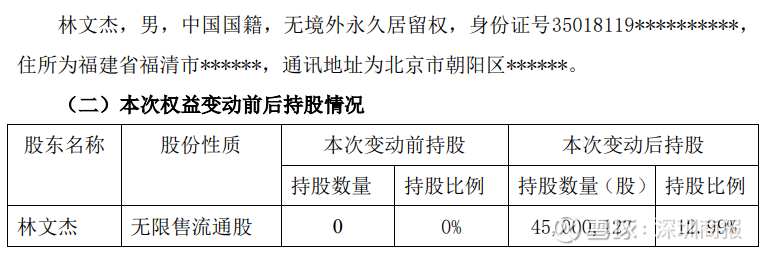 公告显示,林文杰,男,中国国籍,无境外永久居留权,身份证号35018119**********,住所为福建省福清市******,通讯地址为北京市朝阳区******。
