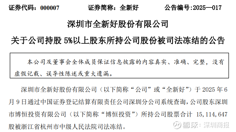 全新好6月9日晚间还公告称,公司于6月9日通过中国证券登记结算有限责任公司深圳分公司系统查询,公司股东深圳市博恒投资有限公司(以下简称“博恒投资”)所持公司股票合计15,114,647股(占总股本4.36%)被浙江省杭州市中级人民法院司法冻结。截至本公告日,博恒投资持有全新好非限售流通股票37,500,000股,占全新好总股本10.82%,经与博恒投资询证,冻结原因为博恒投资与建德隽林企业管理合伙企业(有限合伙)经济纠纷。