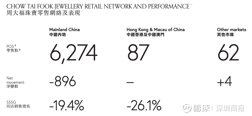 截至2025年3月底,周大福在中国内地拥有6274个周大福珠宝零售点,2025财年其内地市场净关店896家,同店销售下降19.4%。在中国香港及中国澳门的周大福珠宝零售点维持在87个,同店销售下降26.1%。