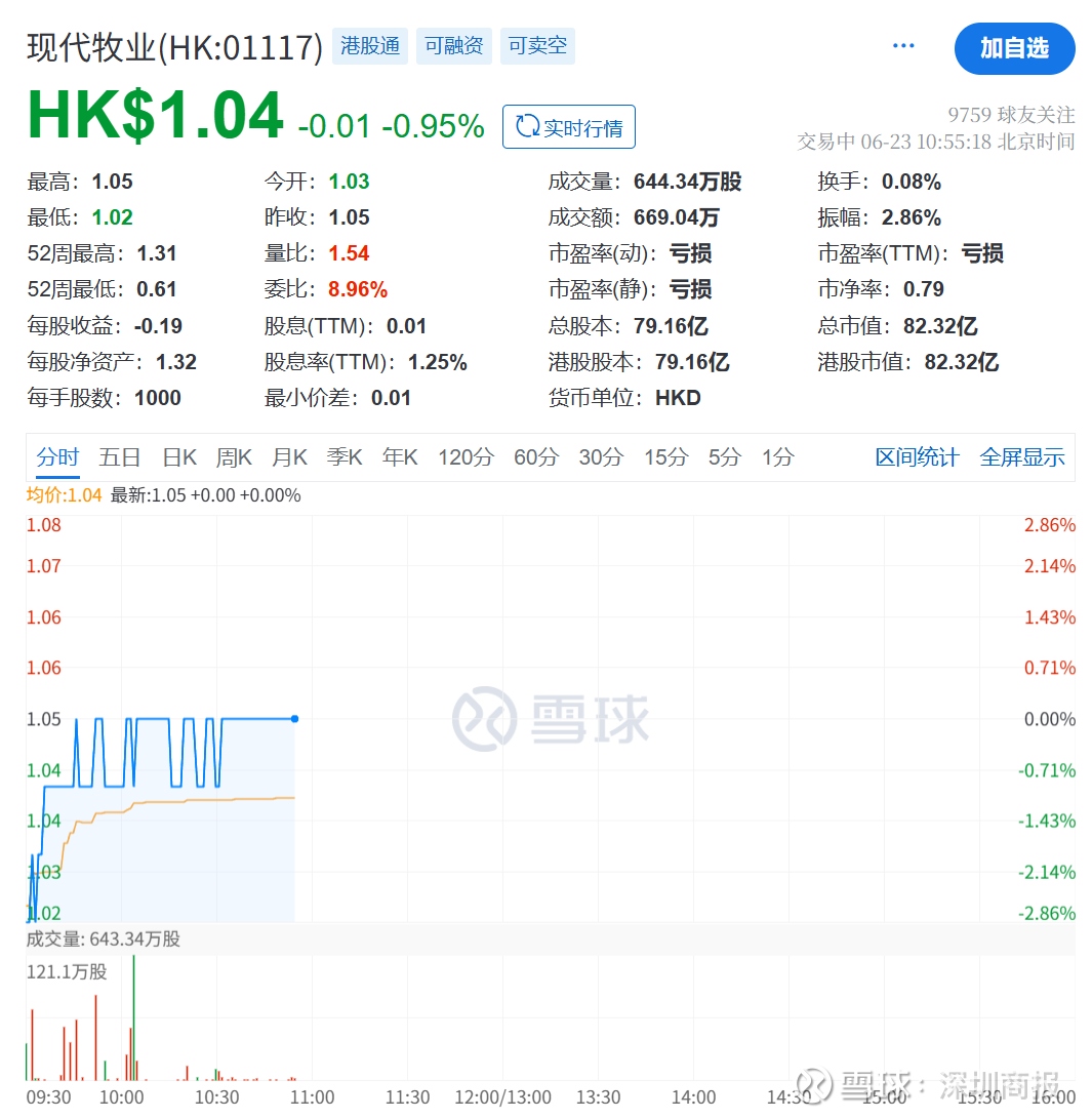 二级市场上,截至23日10点55分,现代牧业下跌0.95%报1.04港元/股,总市值82.32亿港元,股价长期“破发”,较发行价已砍半。