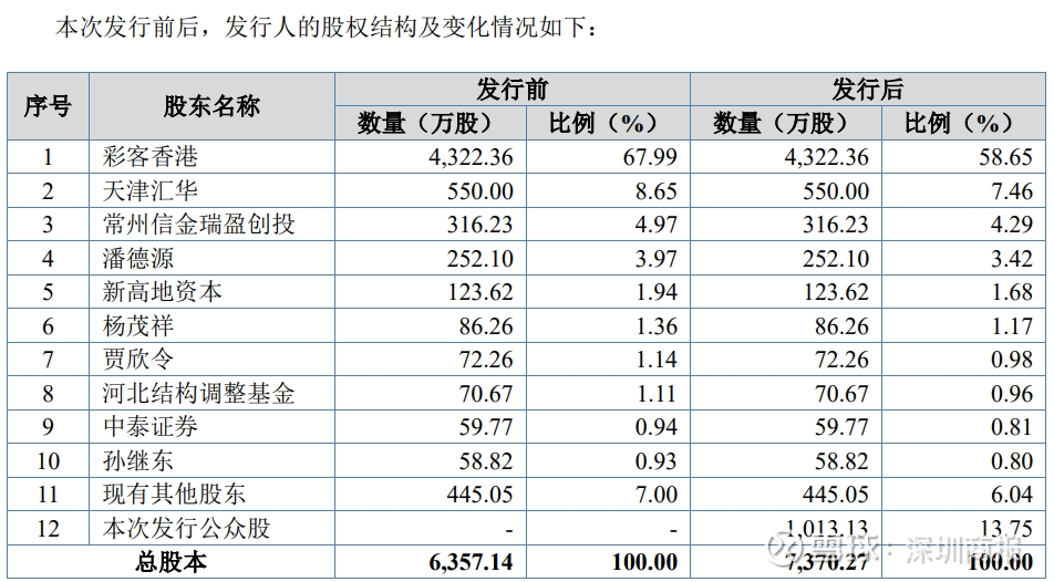 本次发行前后,公司的股权结构及变化情况如下。彩客香港在发行后将仍为持股58.65%的控股股东。