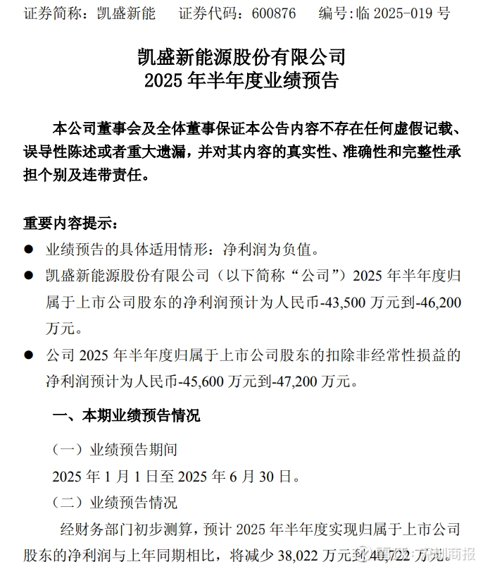 7月15日,凯盛新能(600876/01108)发布公告,公司预计2025年半年度归母净利润为亏损4.35亿元至4.62亿元,与上年同期相比将减少3.80亿元到4.07亿元;扣非归母净利润预计为亏损4.56亿元至4.72亿元,与上年同期相比将减少3.90亿元到4.06亿元。