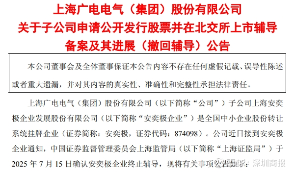 在启动IPO一年半后,广电电气宣布,子公司安奕极于7月15日确认终止辅导。