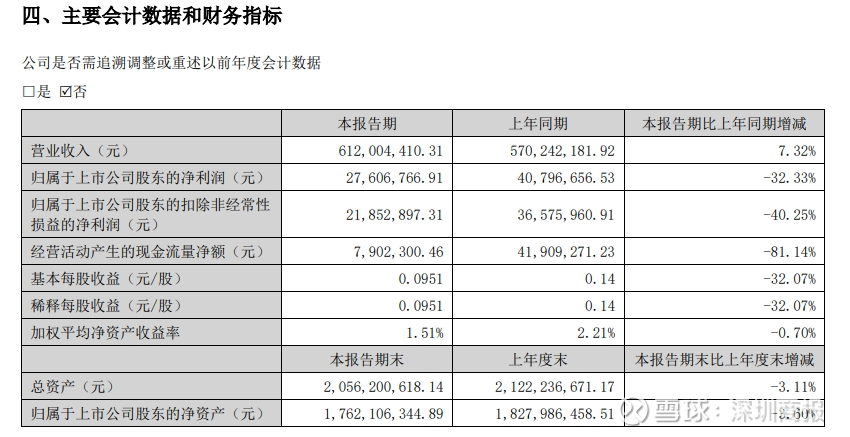 截至二季度末,公司总资产20.56亿元,较上年度末下降3.1%;归母净资产为17.62亿元,较上年度末下降3.6%。