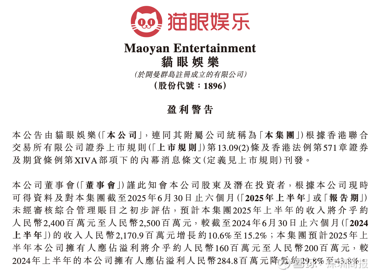 此前,8月6日,中金发表报告指,预期猫眼娱乐或于8月中下旬发布上半年业绩,预计收入25.02亿元,按年增长15.3%,净利润1.65亿元,按年下降42.4%,Non-IFRS净利润2.19亿元,按年下降37.8%,低于市场预期,主因主投影片票房不及预期,而毛利率低于预期。