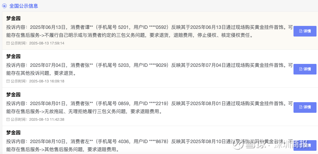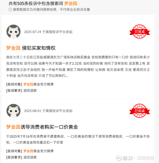 值得关注的是,2024年梦金园因“金包银事件”受到广泛关注。进入2025年,关于其黄金产品质量与服务方面的投诉频繁出现。