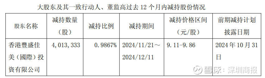 公告显示,此前丰盛佳美曾经于2024/11/21~2024/12/11,在9.11元-9.86元价格区间内减持了4,013,333股,若以减持区间中间价9.485元粗略计算,丰盛佳美套现了约3800万元。