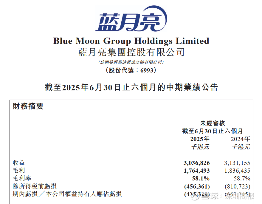 “国民衣物洗护第一品牌”蓝月亮集团(06993)日前发布2025年中期业绩表现,2025年上半年,集团总收益为30.37亿港元,上年同期约31.312亿港元,同比下降3.01%;毛利为17.64亿港元,期内亏损为4.35亿港元。