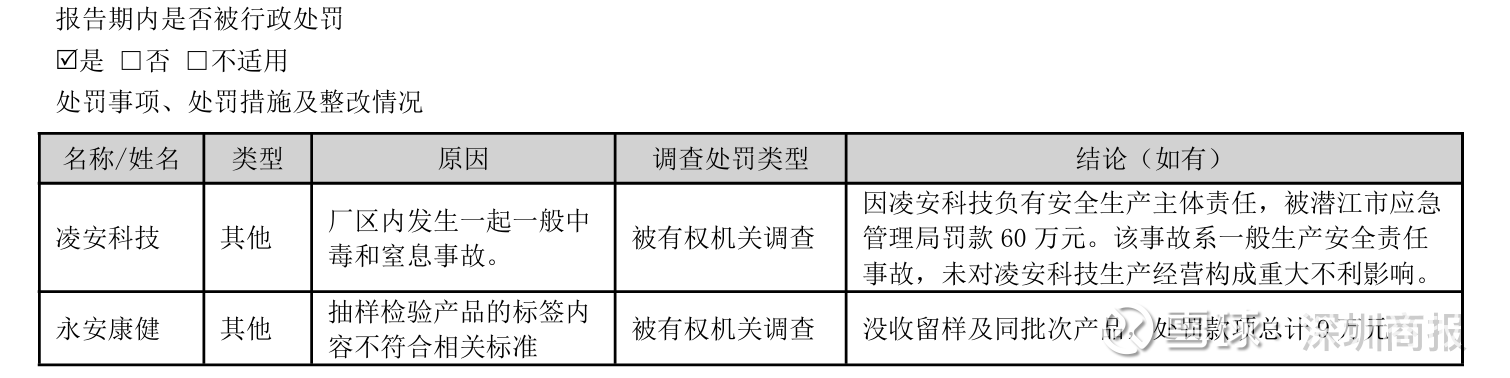 此外,报告期内,凌安科技被潜江市应急管理局罚款60万元,原因为厂区内发生一起一般中毒和窒息事故;永安药业子公司永安康健因抽样检验产品的标签内容不符合相关标准被没收留样及同批次产品,处罚款项9万元。