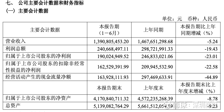 报告期末,公司总资产为51.39亿元,同比下降9.23%;归属于上市公司股东的净资产为41.71亿元,同比下降8.78%。加权平均净资产收益率从去年同期的5.84%降至4.25%,减少1.59个百分点;基本每股收益从0.2346元降至0.1797元。