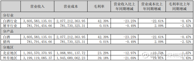 报告期内,公司白酒产业实现营业收入36.06亿元,同比减少23.25%。公司猪肉产业板块实现营业收入8.89亿元,其中,屠宰业务销售收入7.82亿元,种畜养殖业销售收入1.07亿元。