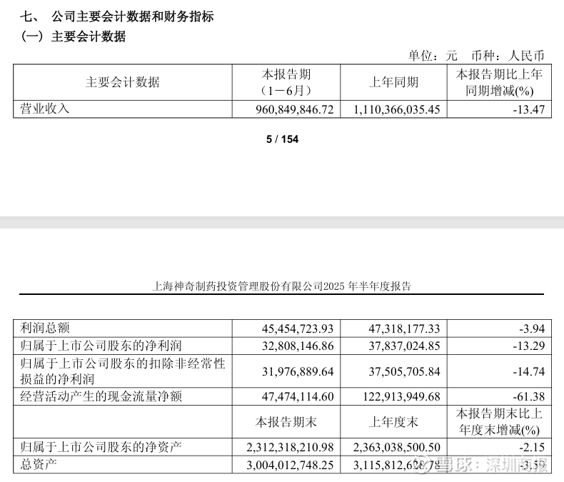 8月29日晚间,神奇制药发布2025半年度报告显示,公司上半年实现营业收入9.61亿元,同比下滑13.47%;归母净利润3280.81万元,同比下滑13.29%;扣非归母净利润3197.69万元,同比下滑14.74%。