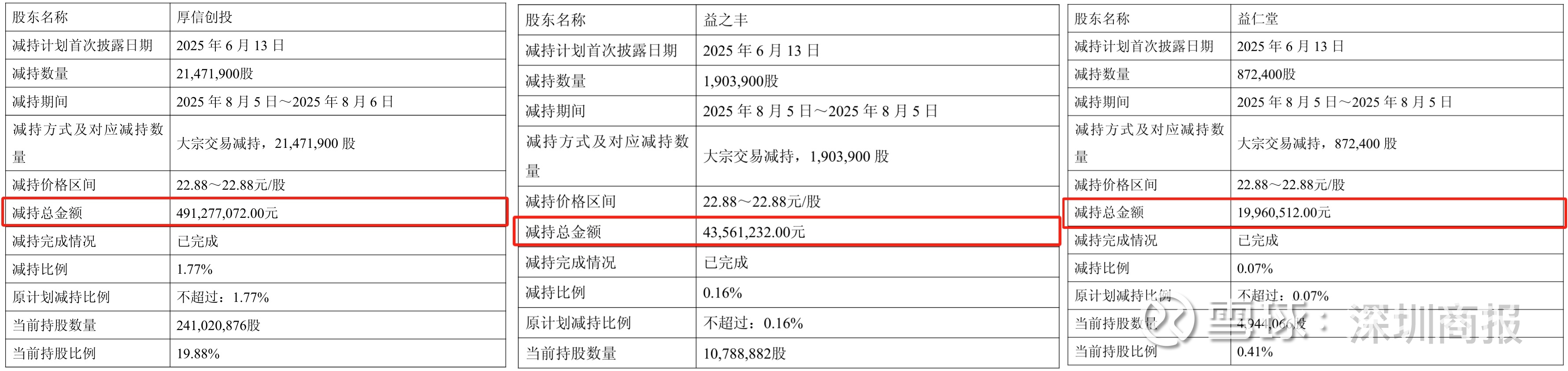 具体来看,厚信创投减持了2147.19万股,减持比例1.77%,减持总金额高达4.91亿元。而其一致行动人益之丰、益仁堂分别减持了190.39万股、87.24万股,减持金额分别为4356。12万元、1996.05万元。