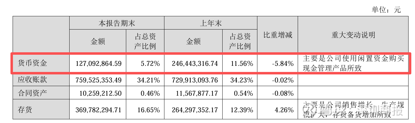今年上半年,公司现金及现金等价物净增加额为-9559.38万元,主要是公司本期购买商品接受劳务支付的现金及理财投资较上年同期增加所致。此外,因公司使用闲置资金购买现金管理产品,其货币资金较上年末显著减少,从2.46亿元骤降至1.27亿元。