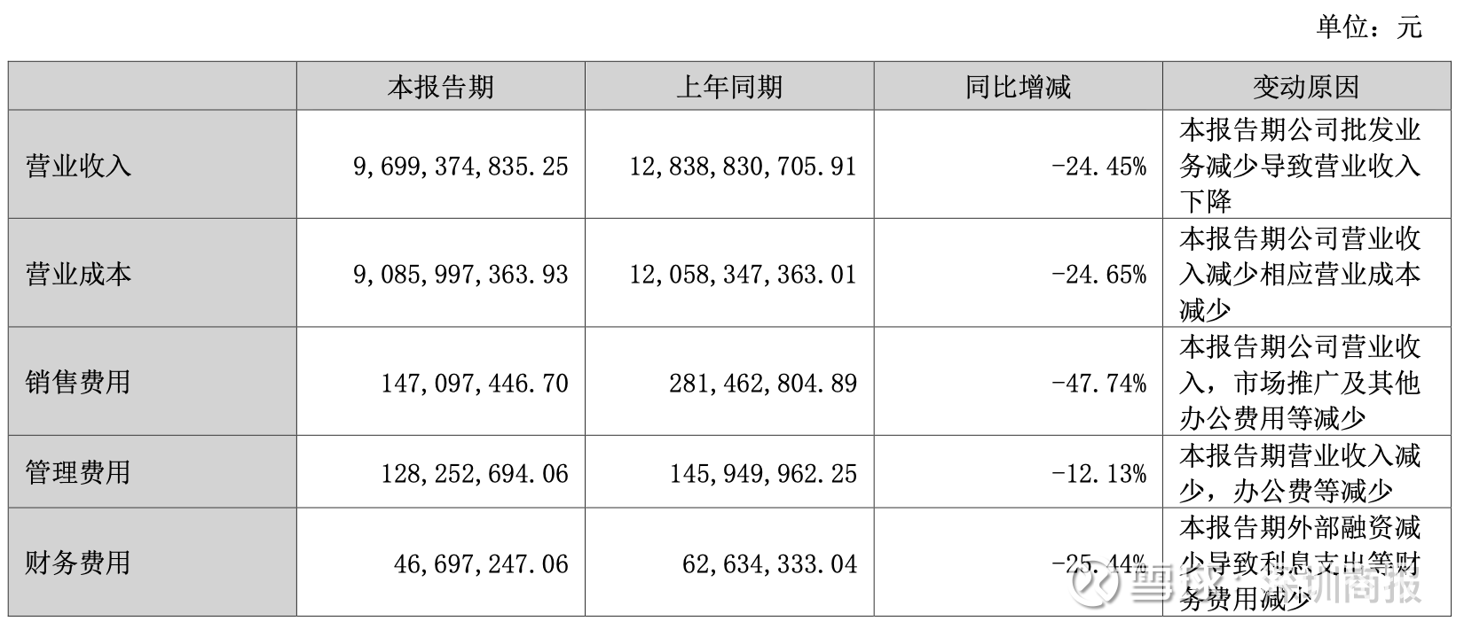 半年报显示,公司批发业务减少导致营业收入下降,同时,公司的营业成本也呈现下滑状态,销售费用、管理费用、财务费用均不同程度缩减。