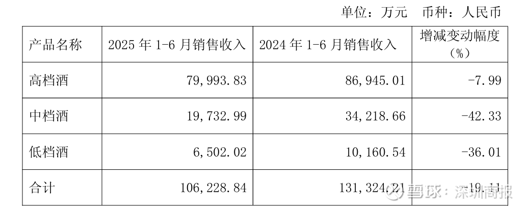 分档次来看,伊力特上半年高档酒销售收入同比下滑7.99%,约为8亿元;中档酒销售收入同比锐减42.33%,约为1.97亿元;低档酒销售收入同比减少36.01%,约为6502.02万元。