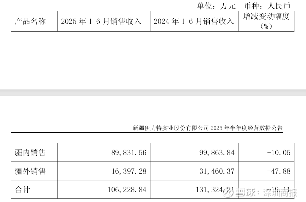 分区域来看,上半年,伊力特在新疆地区实现销售收入8.98亿元,同比减少10.05%;在新疆地区以外实现销售收入1.64亿元,同比下滑47.88%。