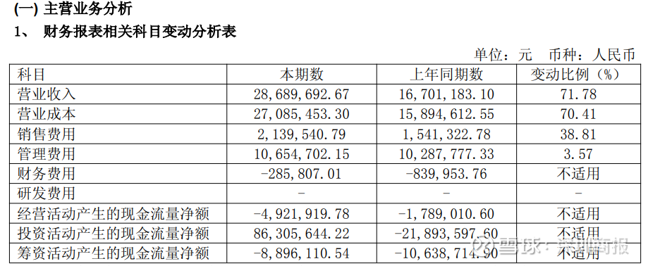 半年报显示,本报告期营业成本同比增加70.41%,主要是本期销售收入增加,销售成本相应增加;本报告期销售费用同比增加38.81%,主要是本期公司加强市场渠道拓展力度支付的费用同比增加;经营活动产生的现金流量净额为-492万元,同比减少313.29万元,主要是本期支付上年末应付采购款以及本期公司采购原材料款项支出同比增加。