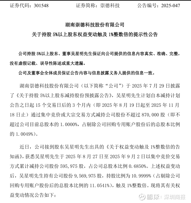 9月2日晚间,崇德科技(301548)发布公告,近日公司持股5%以上股东吴星明先生通过集中竞价交易方式减持公司股份60万股,占公司总股本比例0.6850%。