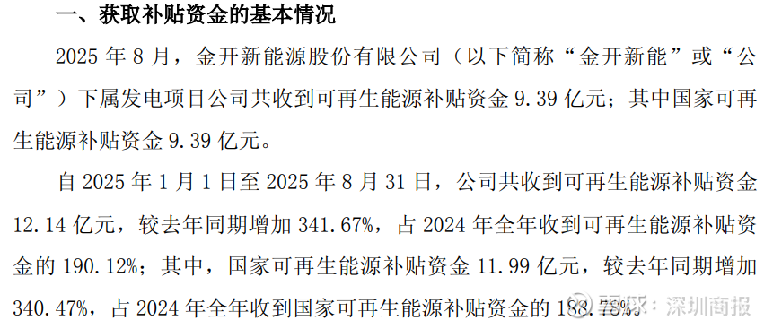 公告称,自2025年1月1日至2025年8月31日,公司共收到可再生能源补贴资金12.14亿元,较去年同期增加341.67%,占2024年全年收到可再生能源补贴资金的190.12%;其中,国家可再生能源补贴资金11.99亿元,较去年同期增加340.47%,占2024年全年收到国家可再生能源补贴资金的188.78%。