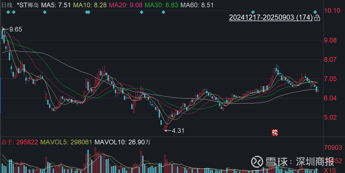 二级市场上,截至9月3日午间收盘,*ST椰岛上涨0.63%报6.39元/股,最新市值28.64亿元,今年来公司股价累计下跌16.36%。