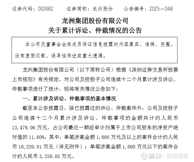 9月3日晚间,龙洲股份(002682)披露,公司及控股子公司在过去十二个月内,累计新增诉讼、仲裁金额约1.35亿元,占最近一期经审计归属于上市公司股东净资产绝对值的11.60%。其中,单笔涉案金额在1000万元及以上的案件共五起,合计金额约1.02亿元。
