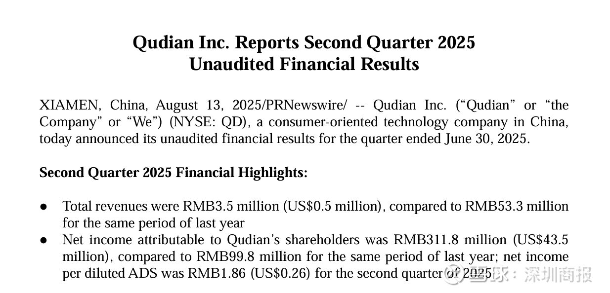 近日,趣店(美股代码:QD)发布2025年第二季度未经审计的业绩。数据显示,其二季度总收入为350万元,与上年同期的5330万元相比下滑93%;股东应占净利润为3.118亿元,上年同期为9980万元。