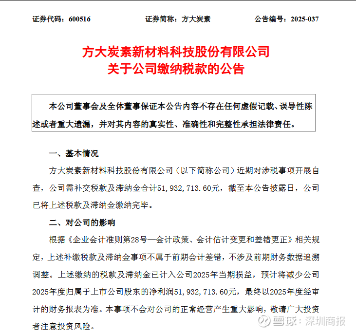 方大炭素表示,根据《企业会计准则第28号—会计政策、会计估计变更和差错更正》相关规定,上述补缴税款及滞纳金事项不属于前期会计差错,不涉及前期财务数据追溯调整。上述缴纳的税款及滞纳金已计入公司2025年当期损益,预计将减少公司2025年度归属于上市公司股东的净利润51,932,713.60元,最终以2025年度经审计的财务报表为准。本事项不会对公司的正常经营产生重大影响,敬请广大投资者注意投资风险。