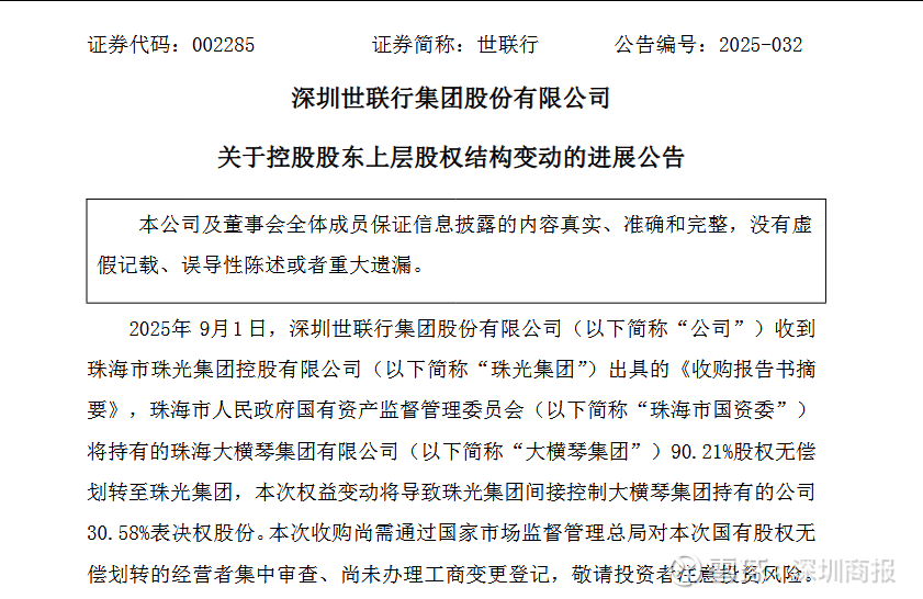 2025年9月1日,世联行收到珠光集团出具的《收购报告书摘要》。根据公告,珠海市国资委将其持有的珠海大横琴集团有限公司90.21%的股权无偿划转至珠光集团。此次权益变动完成后,大横琴集团的控股股东将由珠海市国资委变更为珠光集团。