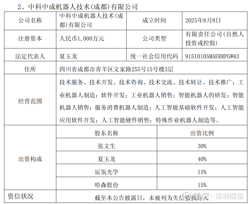 公告显示,辰瓴光学、中科中成经营范围均包括机器人业务,由此可以看出哈森股份在加码机器人赛道上的努力。至于辰瓴光学、中科中成与上市公司之间的关系,公告介绍,公司正在筹划发行股份收购辰瓴光学100%股权;公司控股子公司江苏哈森工业智能装备有限公司于2025年2月24日与辰瓴光学签订合作框架协议;公司与夏玉龙、辰瓴光学等共同出资设立中科中成,公司董事兼财务负责人伍晓华担任中科中成财务负责人。