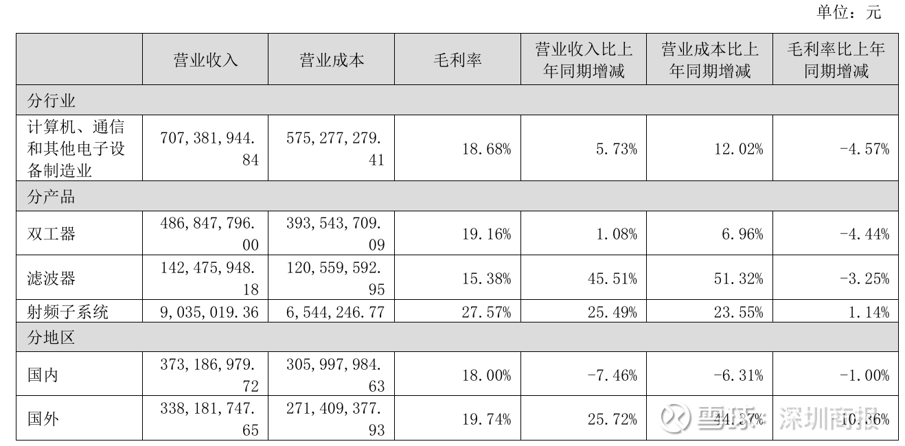 具体来看,公司两大主营产品的盈利能力均面临压力。双工器的营收同比微增1.08%,而滤波器的营收则显著增长45.51%,然而,两者的毛利率却分别下滑了4.44%和3.25%。