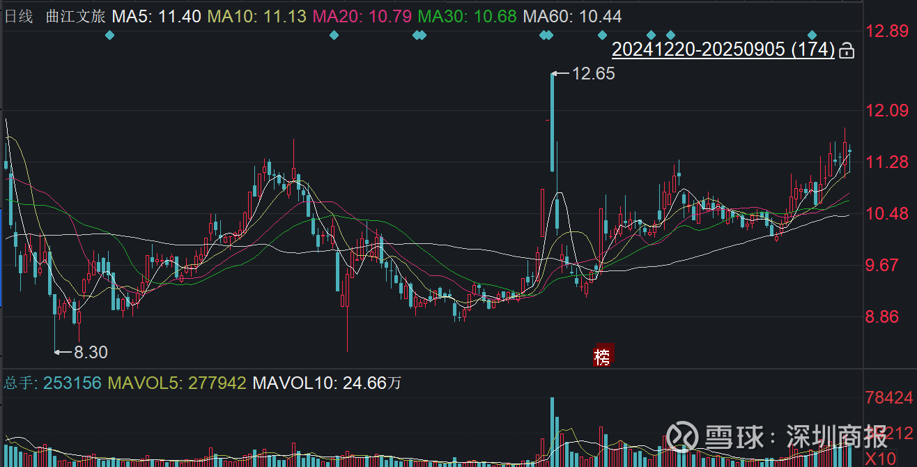 二级市场上,截至9月5日收盘,曲江文旅下跌1.30%报11.42元/股,最新市值29.13亿元,今年来公司股价累计上涨近两成。
