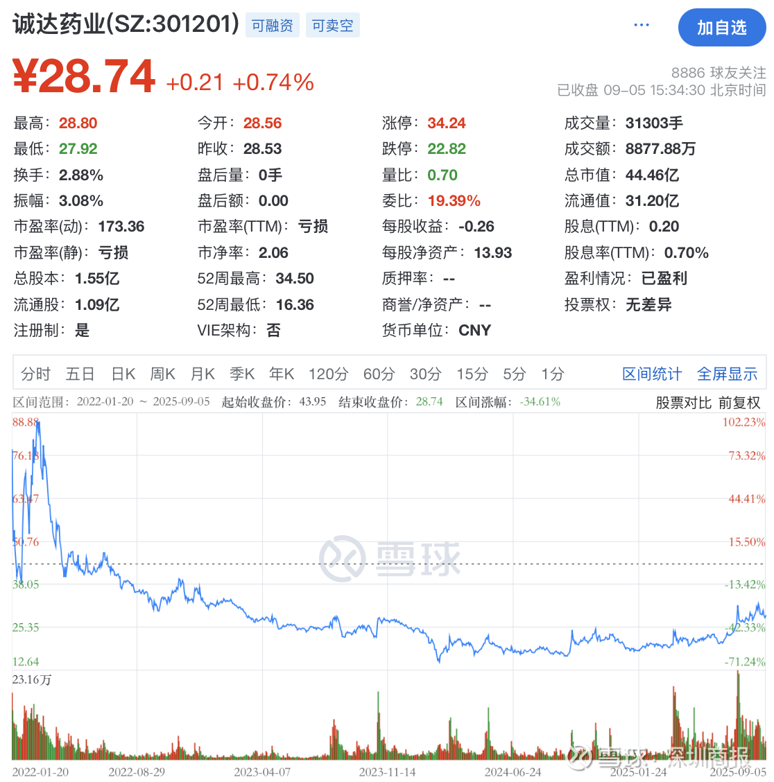 截至9月5日收盘,诚达药业报28.74元/股,总市值44.46亿元。上市至今,公司股价整体已跌去34%。