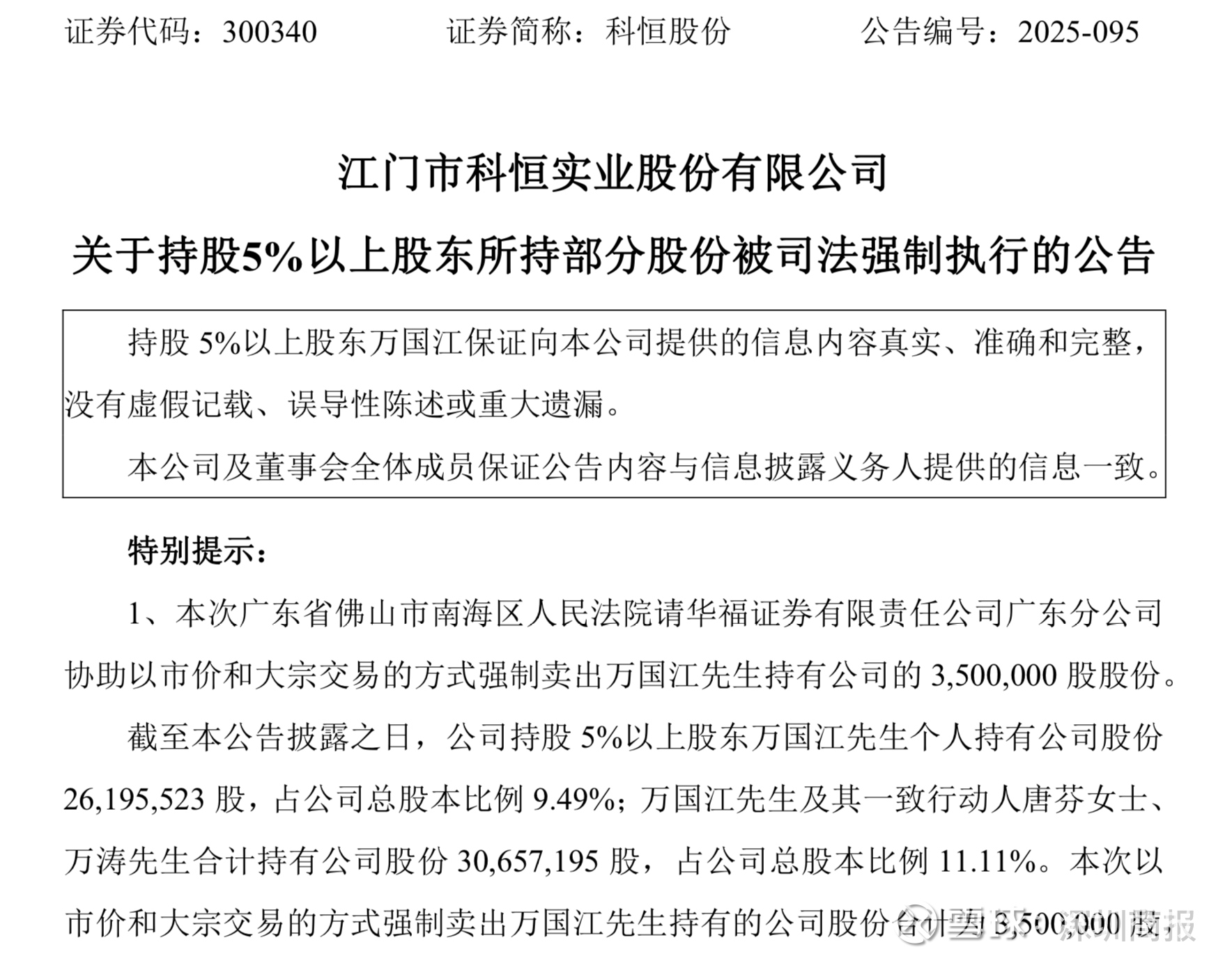 9月5日,科恒股份(300340)发布公告,公司持股5%以上股东万国江因其未能履行广东省佛山市南海区人民法院的执行裁定书,南海法院向华福证券送达了协助执行通知书,请其协助以市价和大宗交易的方式强制卖出万国江所持公司350万股股份。