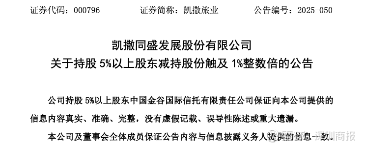 公告显示,2025年9月5日至2025年12月4日,金谷信托拟通过集中竞价方式减持凯撒旅业股份不超过1603.79万股,即不超过公司总股本的1%,通过大宗交易方式减持公司股份不超过3207.58万股,即不超过公司总股本的2%。