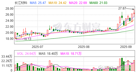 熊鹰选择的时机值得关注,二级市场上,长江材料近期表现活跃。8月26日开始,在8个交易日内录得4个涨停,累计涨幅达26.32%,累计换手率为198.60%。截至发稿,长江材料股价26.63元,市值为39.84亿元。