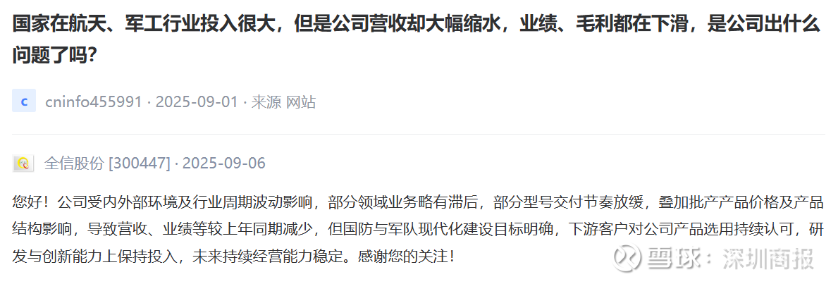 9月6日,全信股份回应表示,公司受内外部环境及行业周期波动影响,部分领域业务略有滞后,部分型号交付节奏放缓,叠加批产产品价格及产品结构影响,导致营收、业绩等较上年同期减少,但国防与军队现代化建设目标明确,下游客户对公司产品选用持续认可,研发与创新能力上保持投入,未来持续经营能力稳定。