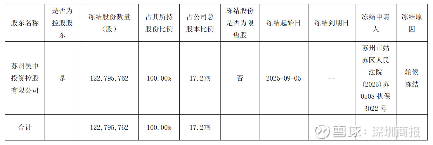 同日晚间,*ST苏吴还发布控股股东所持股份被轮候冻结的公告,截至目前,苏州吴中投资控股有限公司所持公司122,795,762股股份已全部处于质押/司法标记/司法冻结/轮候冻结状态。
