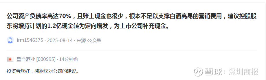 9月9日,针对投资者提出的“公司资产负债率高达70%,且账上现金也很少,根本不足以支撑白酒高昂的营销费用,建议控股股东将增持计划的1.2亿现金转为定向增发,为上市公司补充现金。”的问题,皇台酒业(000995)在互动平台回应称,感谢建议。