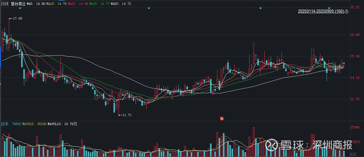 二级市场上,截至9月9日收盘,皇台酒业下跌0.53%报14.98元/股,最新市值26.58亿元,近一年来公司股价累计上涨八成。