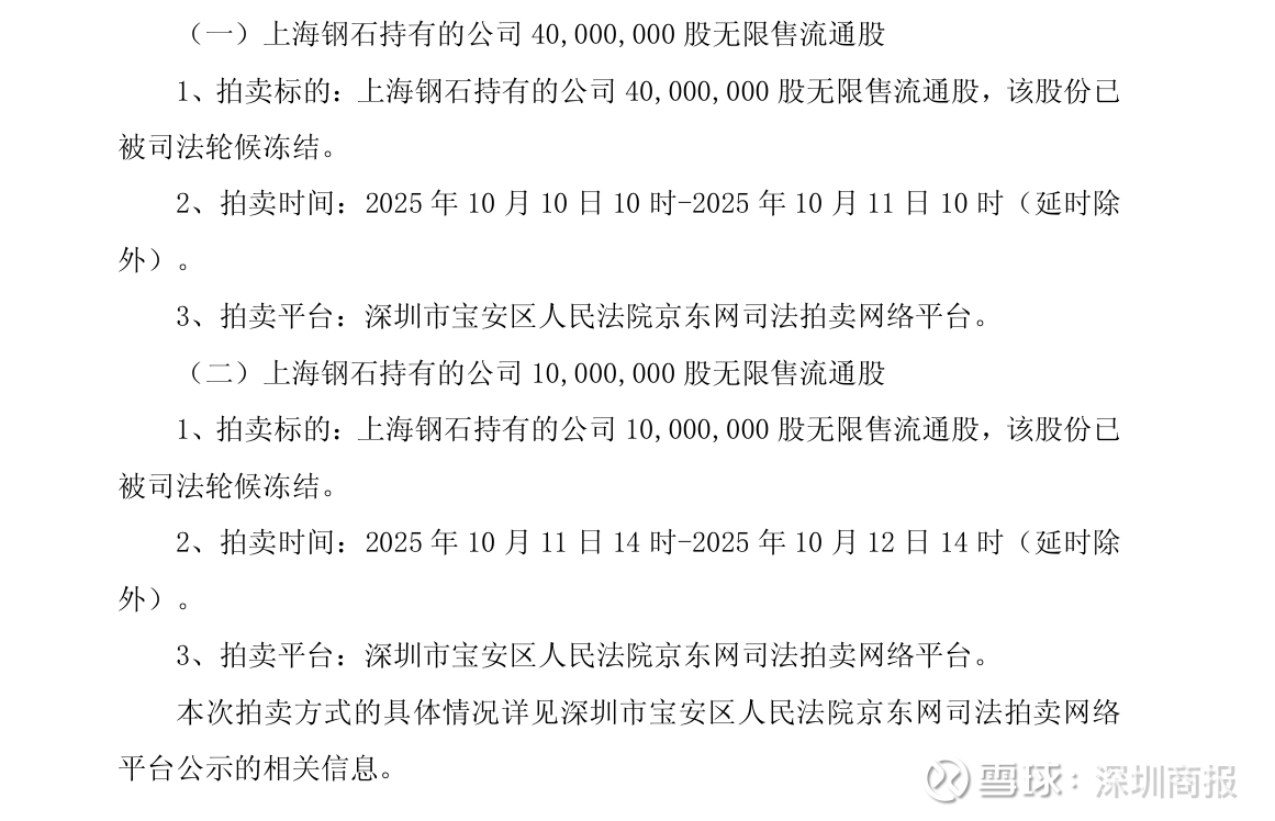 其中,上海钢石所持4000万股股份将于2025年10月10日10时至10月11日10时(延时除外)进行公开拍卖,1000万股股份将于10月11日14时至10月12日14时(延时除外)进行公开拍卖。