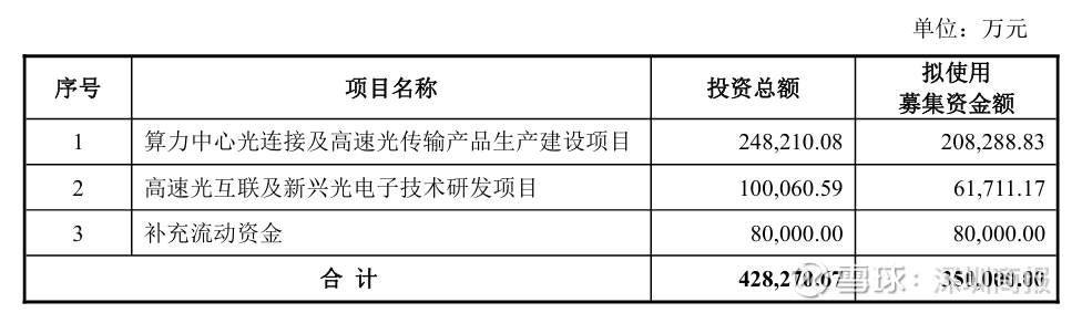 光迅科技本次发行拟募集不超过35亿元,其中,20.83亿元用于算力中心光连接及高速光传输产品生产建设项目;6.17亿元用于高速光互联及新兴光电子技术研发项目;8亿元用于补充流动资金。