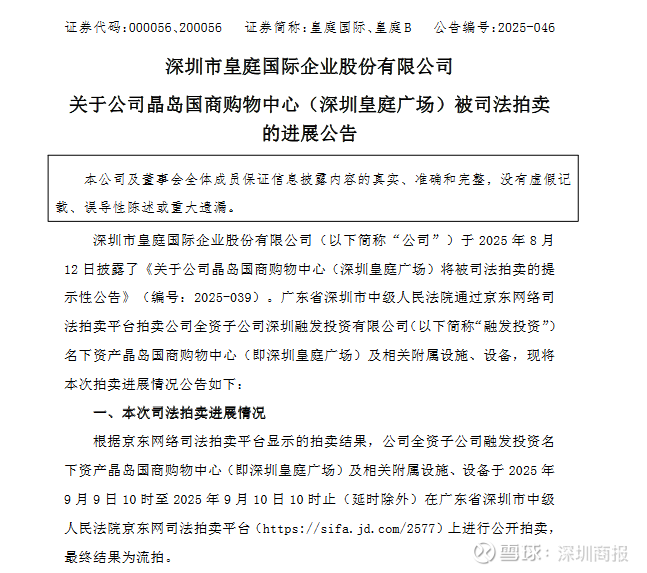 9月10日晚间,皇庭国际(000056)发布公告,公司全资子公司融发投资名下的晶岛国商购物中心(深圳皇庭广场)于2025年9月9日至10日进行了司法拍卖,最终结果为流拍。该资产的账面价值为57.5亿元,占公司总资产的71.57%,2024年项目收入为3.69亿元,占公司全年营业收入的56.03%。