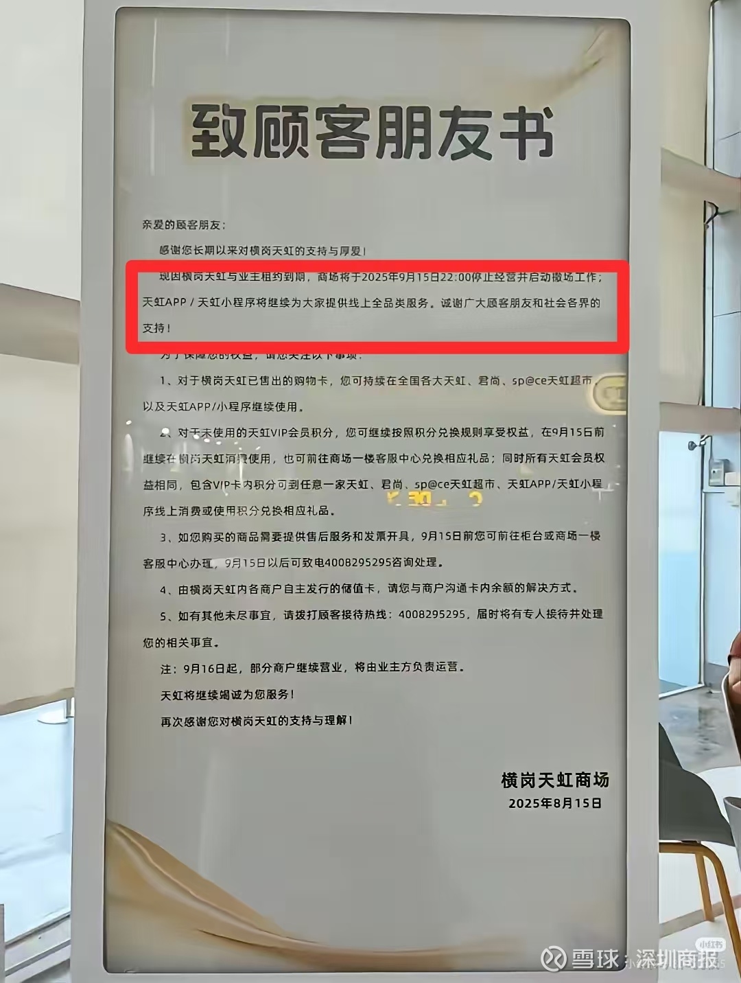 近日,一则深圳横岗天虹商场将于9月15日闭店的消息备受关注。横岗天虹自2010年底开业,曾是龙岗区域的“人气地标”,陪伴居民近15年,如今悄然谢幕,成为传统百货商超“退潮”的又一缩影。